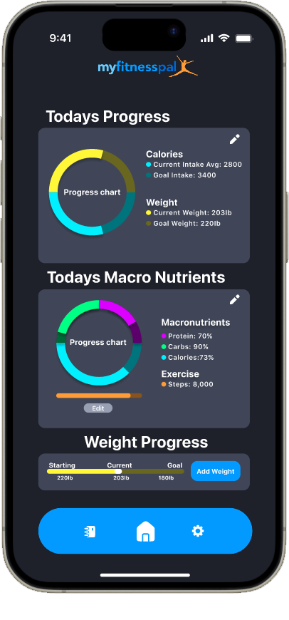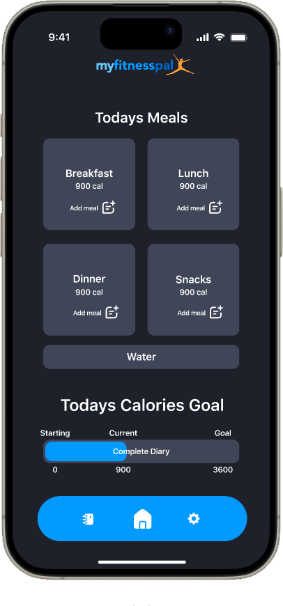 To improve the MyFitnessPal app's design, I started by looking at what I didn't like, mainly focusing on the front page and the food diary entry. I found these areas lacking in detail. The front page didn't show users' goals clearly, and there was limited visual progress. To address this, I introduced graphics and vibrant colors to make the front page more engaging.