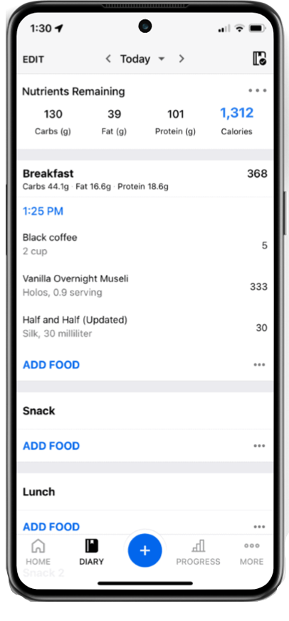 Regarding the Diary, I organized meals into four sections to eliminate the need for scrolling. This layout allows you to view all meals at once. Moreover, you can see the entire meal without having to add ingredients separately. This adjustment ensures that you only see relevant information, avoiding unnecessary details.